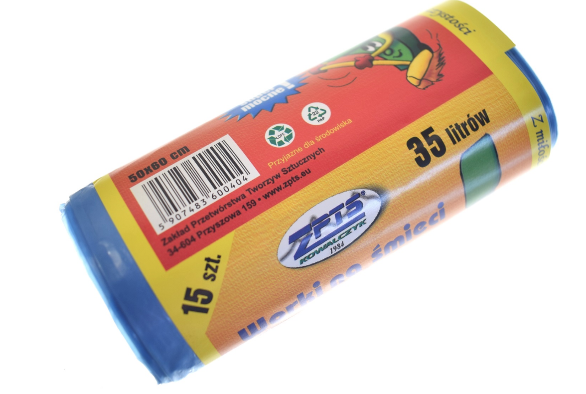 Zestaw 10 rolek po 15 sztuk worków na śmieci 35L o wymiarach 50x60 cm.