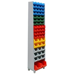 Ten kompaktowy regał o wymiarach 1950x490x360 mm jest idealnym rozwiązaniem dla każdego, kto potrzebuje efektywnego systemu przechowywania. W zestawie znajduje się 58 pojemników w różnych rozmiarach, co pozwala na doskonałą organizację narzędzi, drobnych części lub produktów w sklepie, biurze, czy warsztacie. Regał wykonany z solidnej płyty meblowej w szarym kolorze, zapewnia trwałość i nowoczesny wygląd.